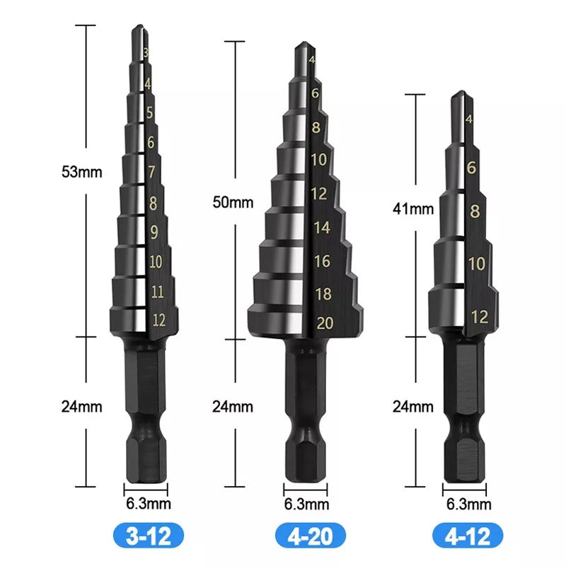 - Juego de 3 brocas escalonadas HSS. De 3/12mm, 4/12mm y 4/20mm.