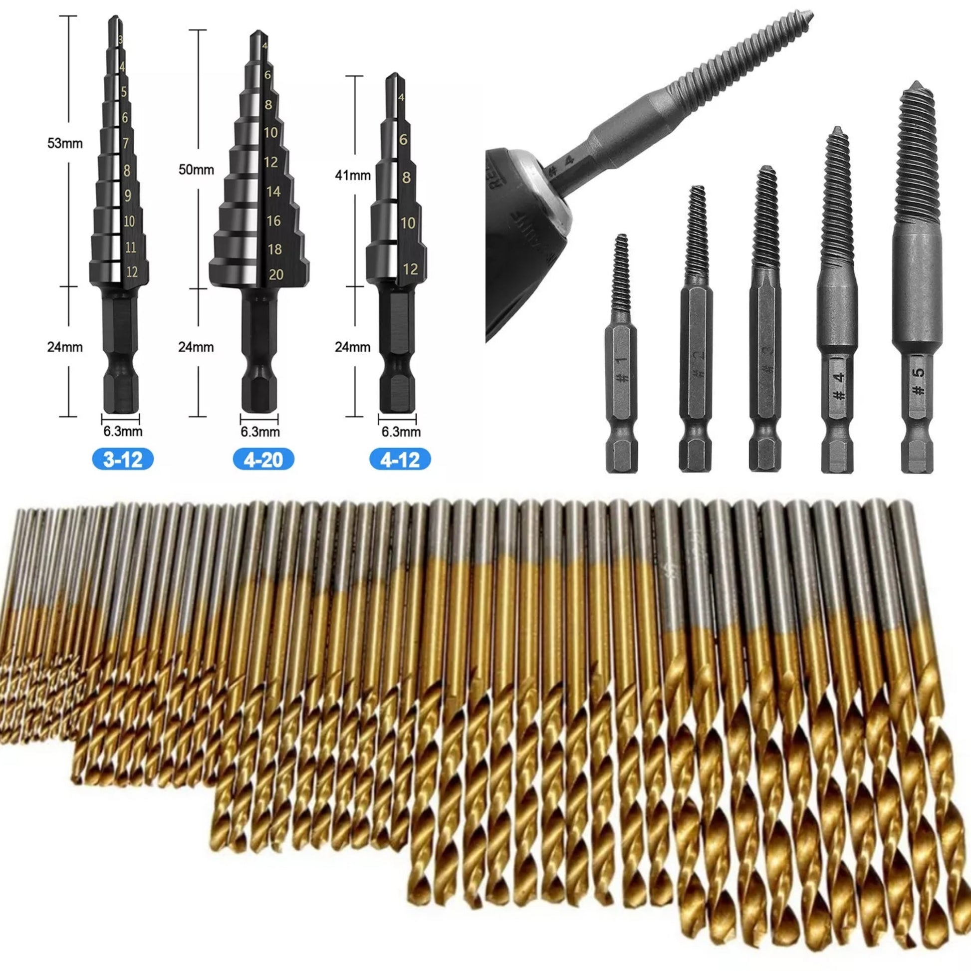 NUEVO. Lote de 58 herramientas para perforar metales , PVC , madera , etc.. Se compone de: