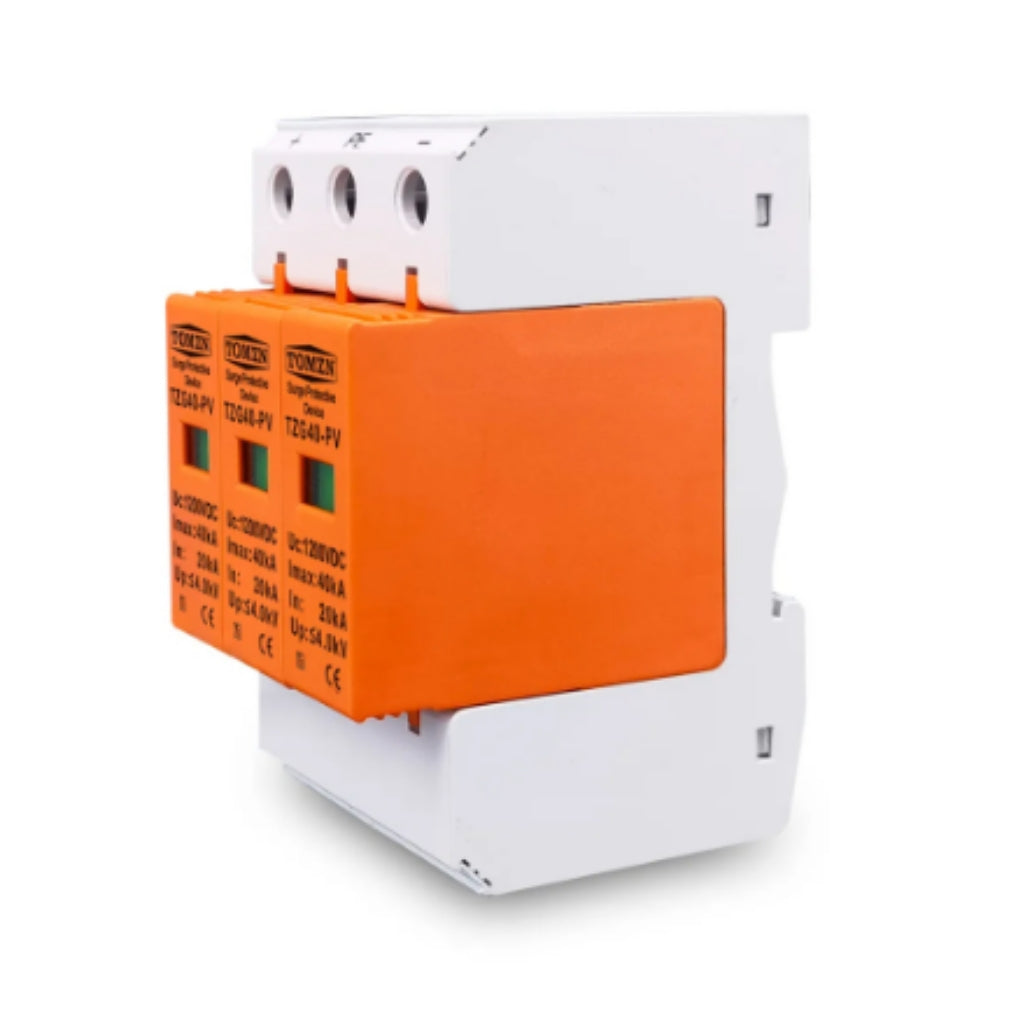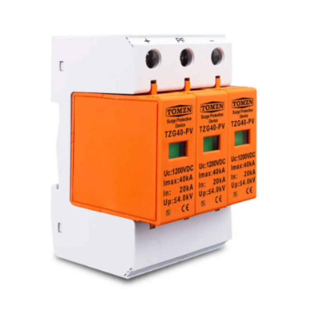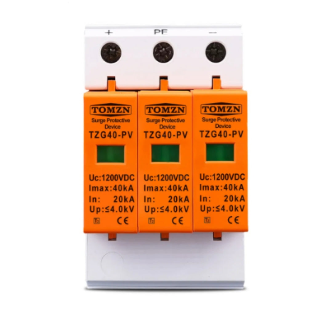 Protector limitador sobretensiones transitorias SPD Solar 20-40KA para energía fotovoltaica, placas solares. Con descarga a tierra. Características: Uc: 1200VDC, Imax: 40kA, In: 20kA, Up: 4.0kV. Protección en instalaciones solares de energía continua.