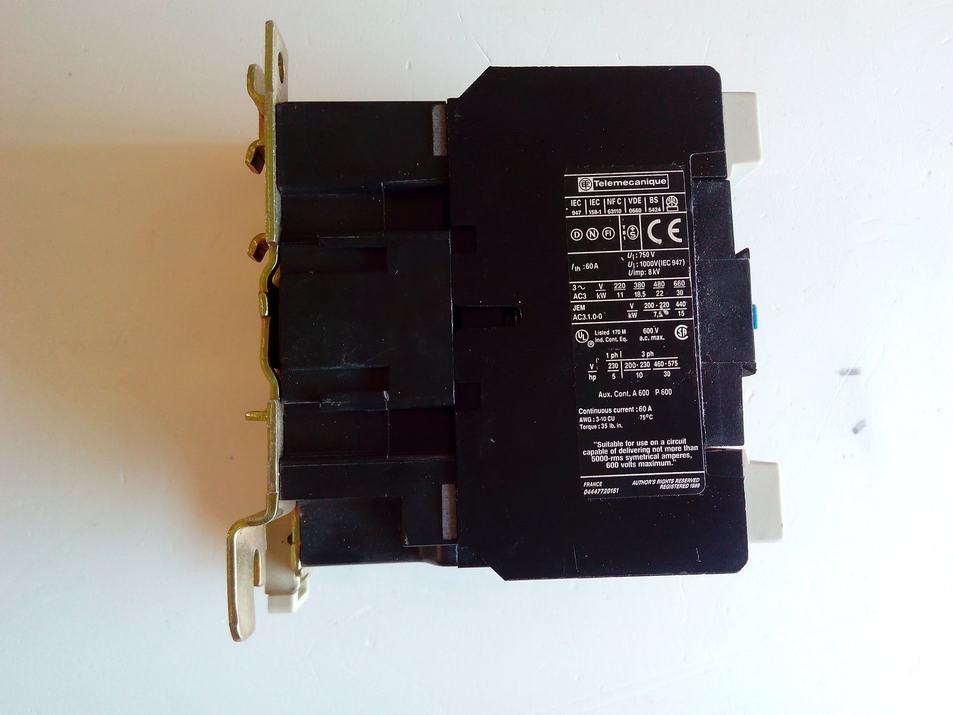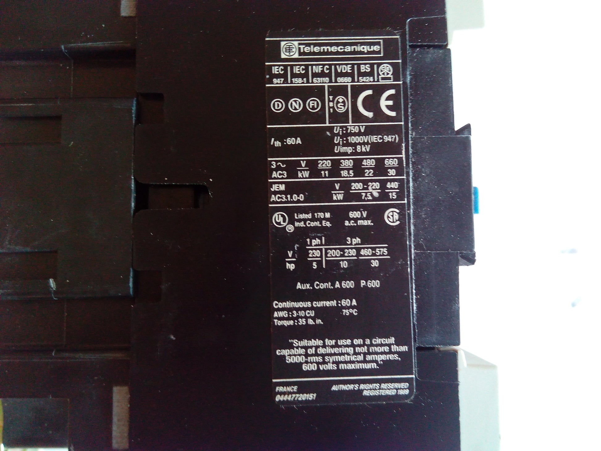 NUEVO Contactor Telemecanique LC1D4011-M5 60A Trifasico LX D6M5. Bobina 230Vac 50/60hz alterna. Modulo ancho, gran tamaño 1000v 8kv. 220/380/415/690/750V. Un contacto auxiliar abierto 13-14 NO y otro cerrado 21-22 Nc.