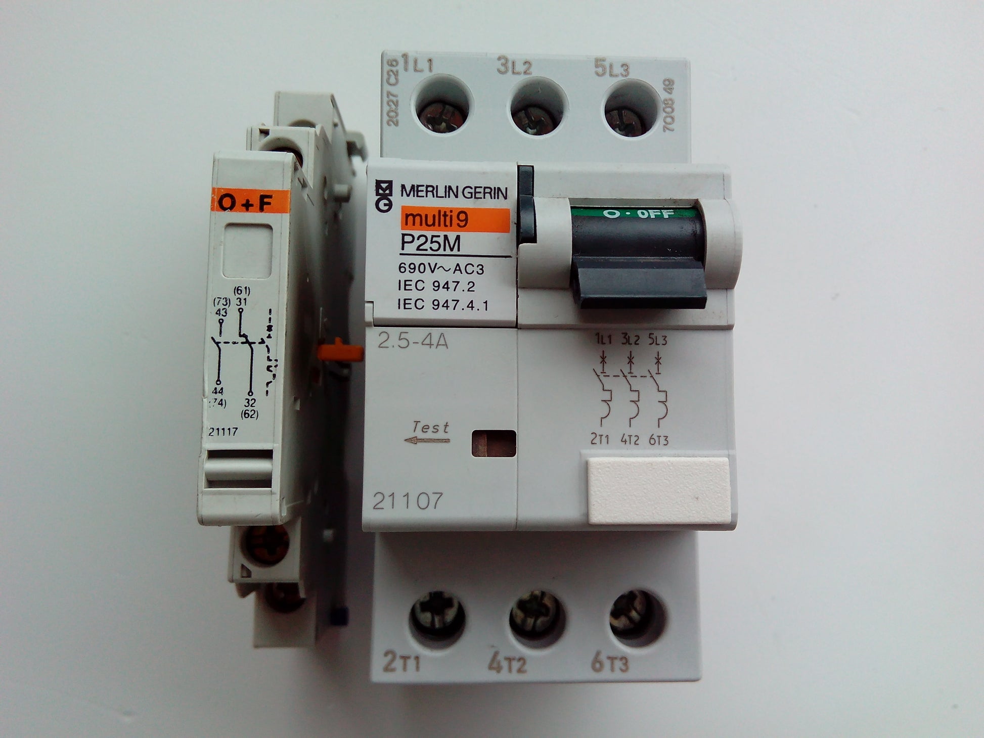 Seminuevo. Lote Disyuntor guardamotor Merlin Gerin P25M. Intensidad Nominal: 25A. 2,5A-4A, 3 polos (21107) + Bloque contacto Auxiliar O+F 6A (21117). En perfecto estado, comprobado.