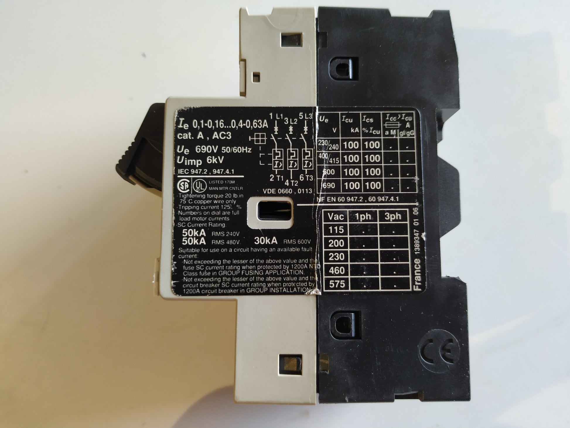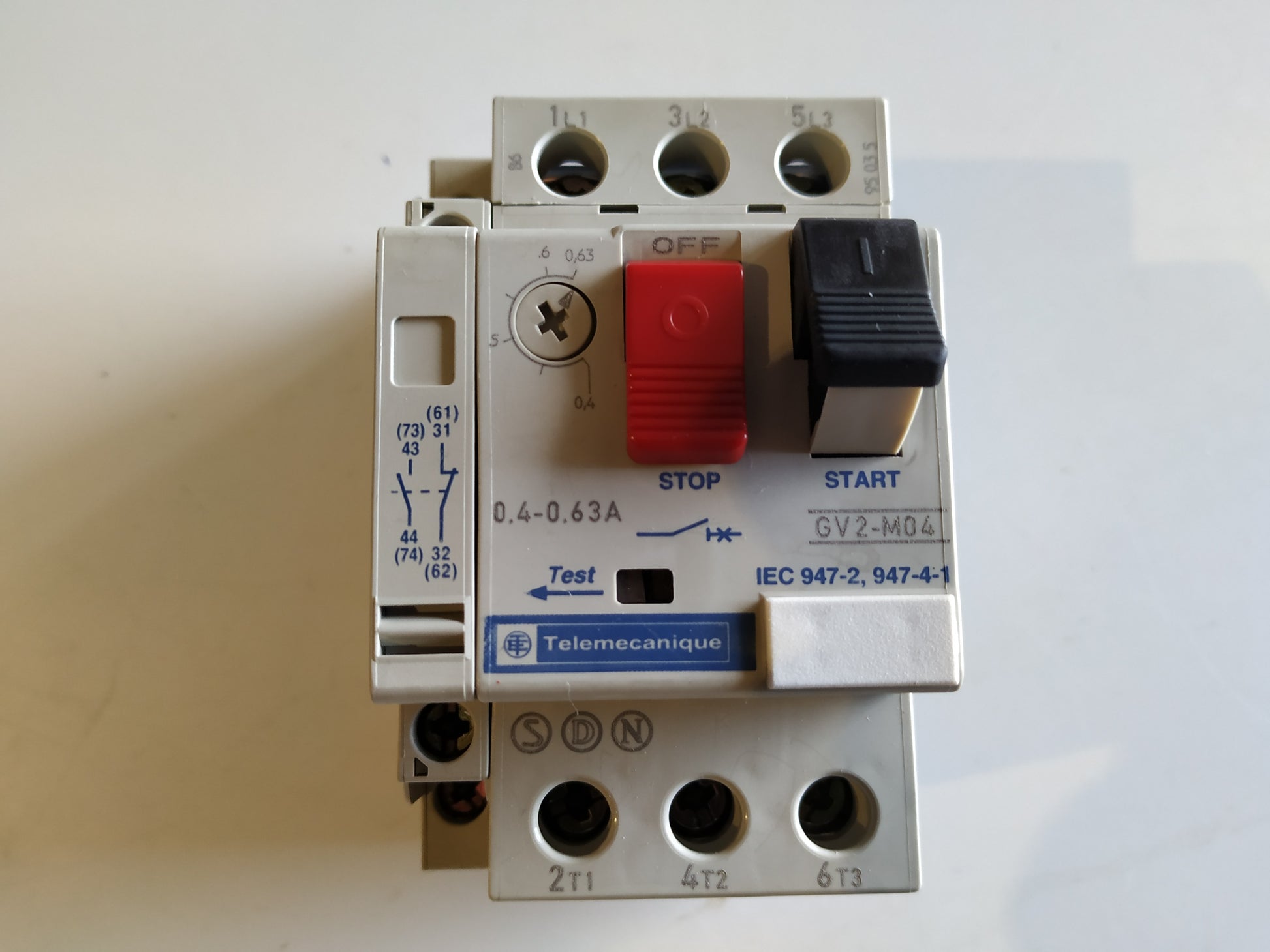 Seminuevo (STOCK B1: 3 + 2 piso) Guarda motor Telemecanique GV2-M04. Protector motor regulable ajustable de 0.4-0.63A. 3 polos. Voltaje máximo 690v. Con modulo GV2-AN11 2 contactos auxiliares 1 NO y 1 NC.