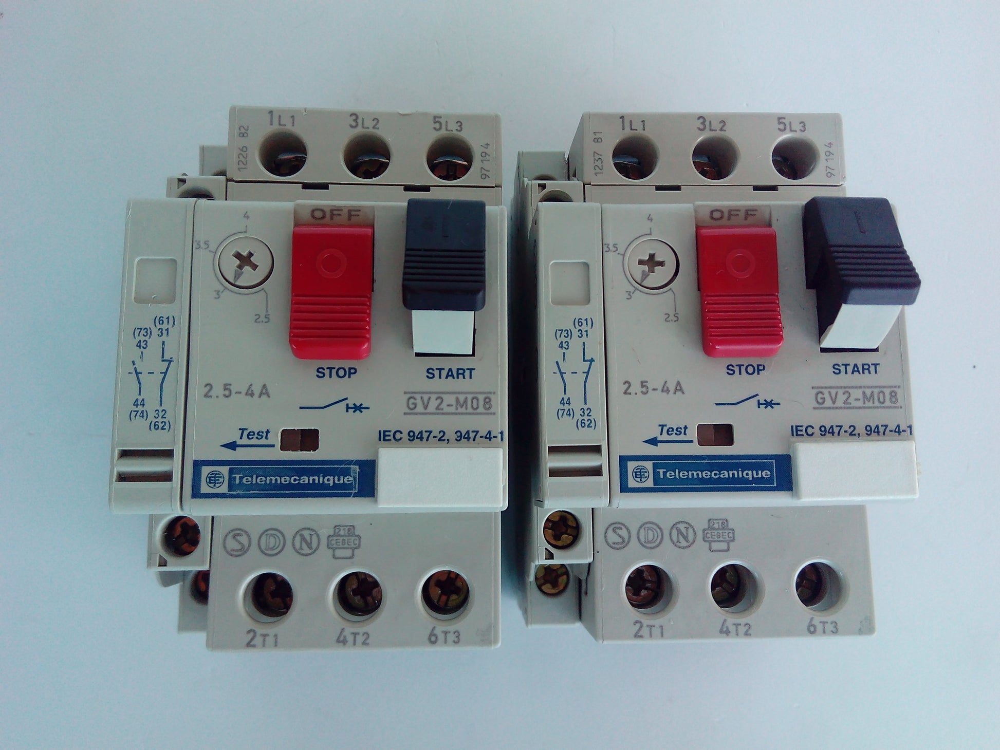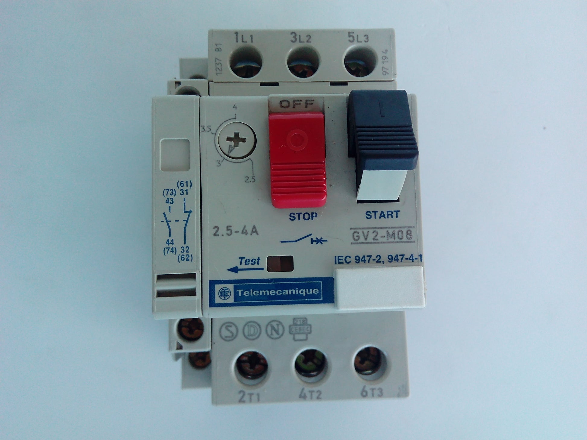 Semi nuevo. Guarda motor Disyuntor Telemecanique GV2-M08. Protector motor regulable ajustable de 2,5-4A. 3 polos. Voltaje máximo 690v. Con modulo GV2-AN11 2 contactos auxiliares 1 NO y 1 NC. Perfecto estado.