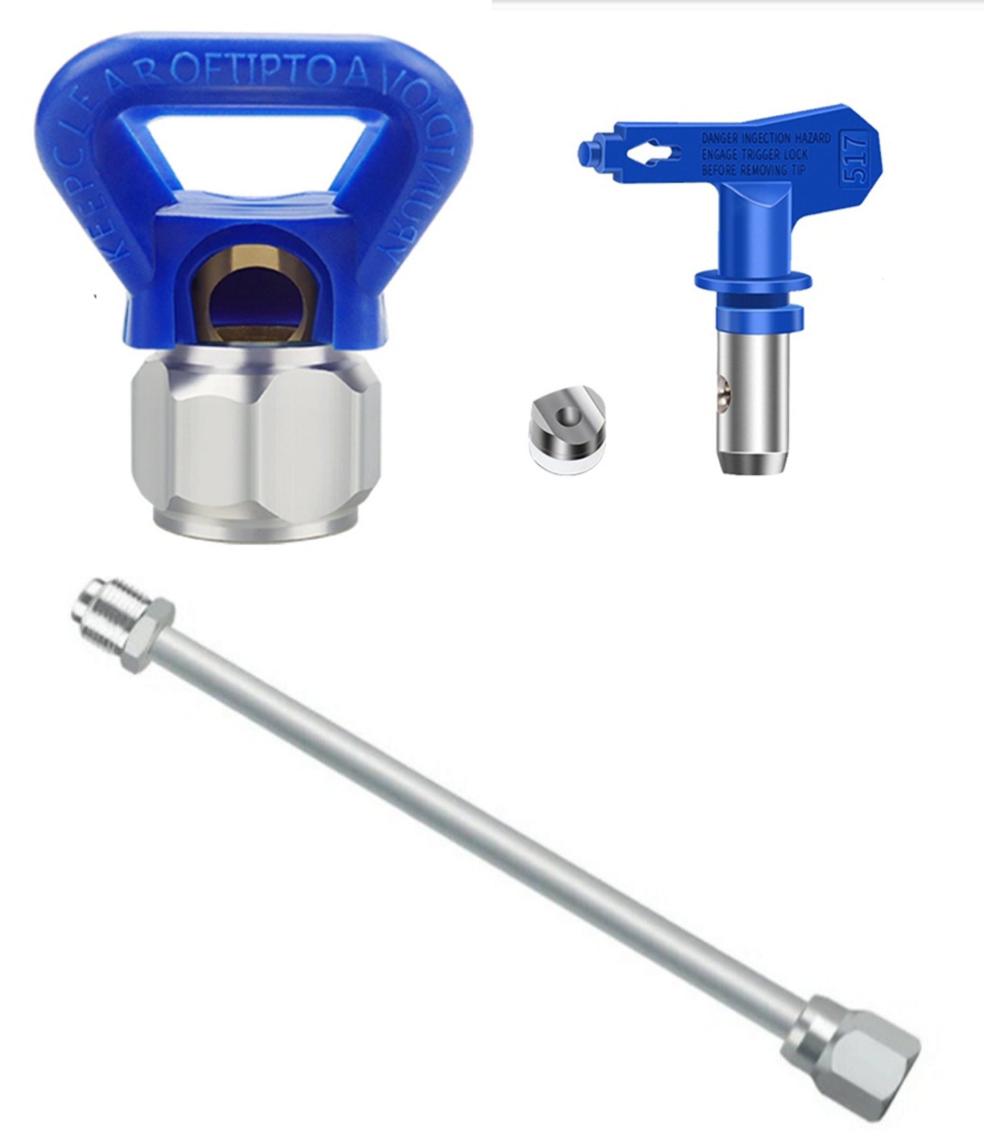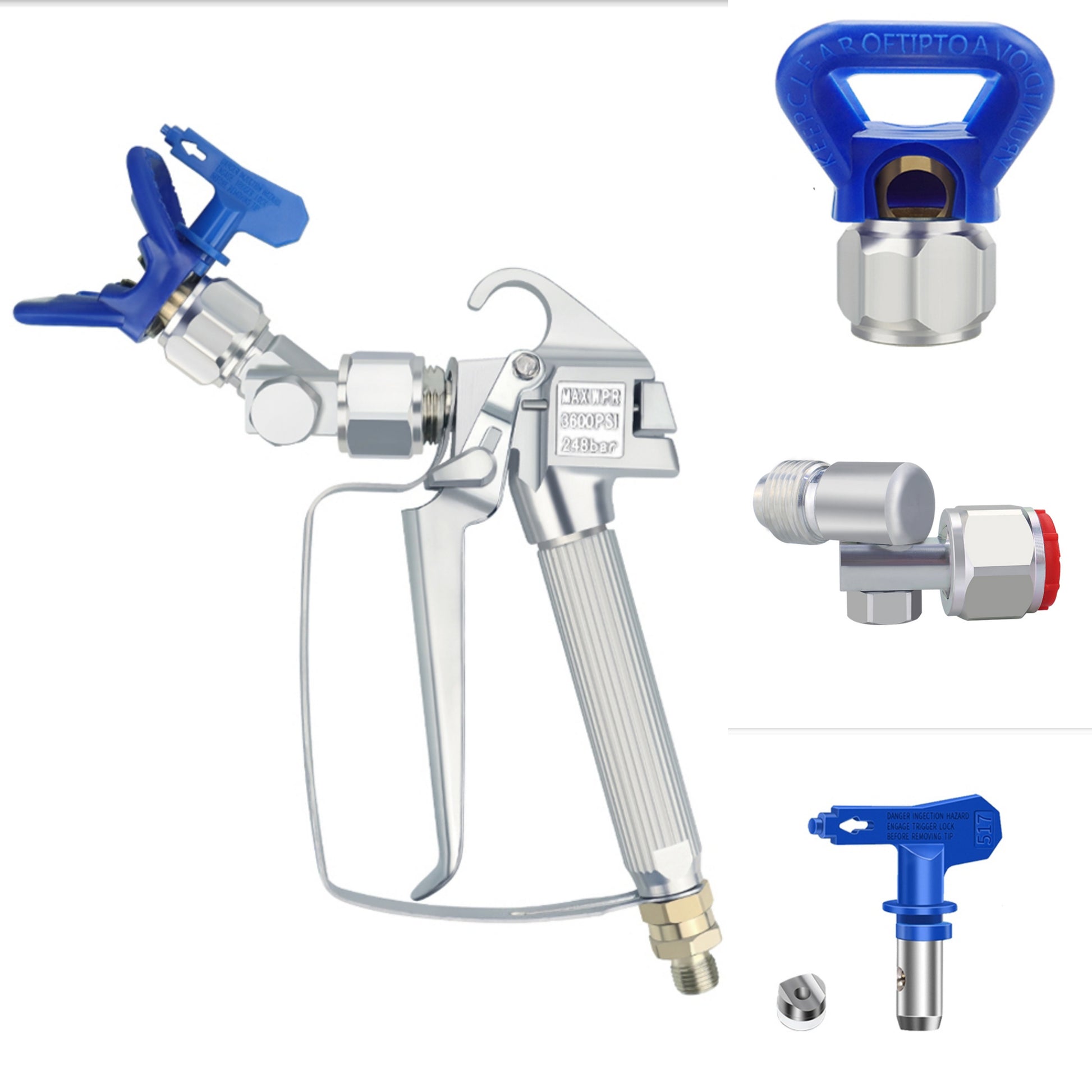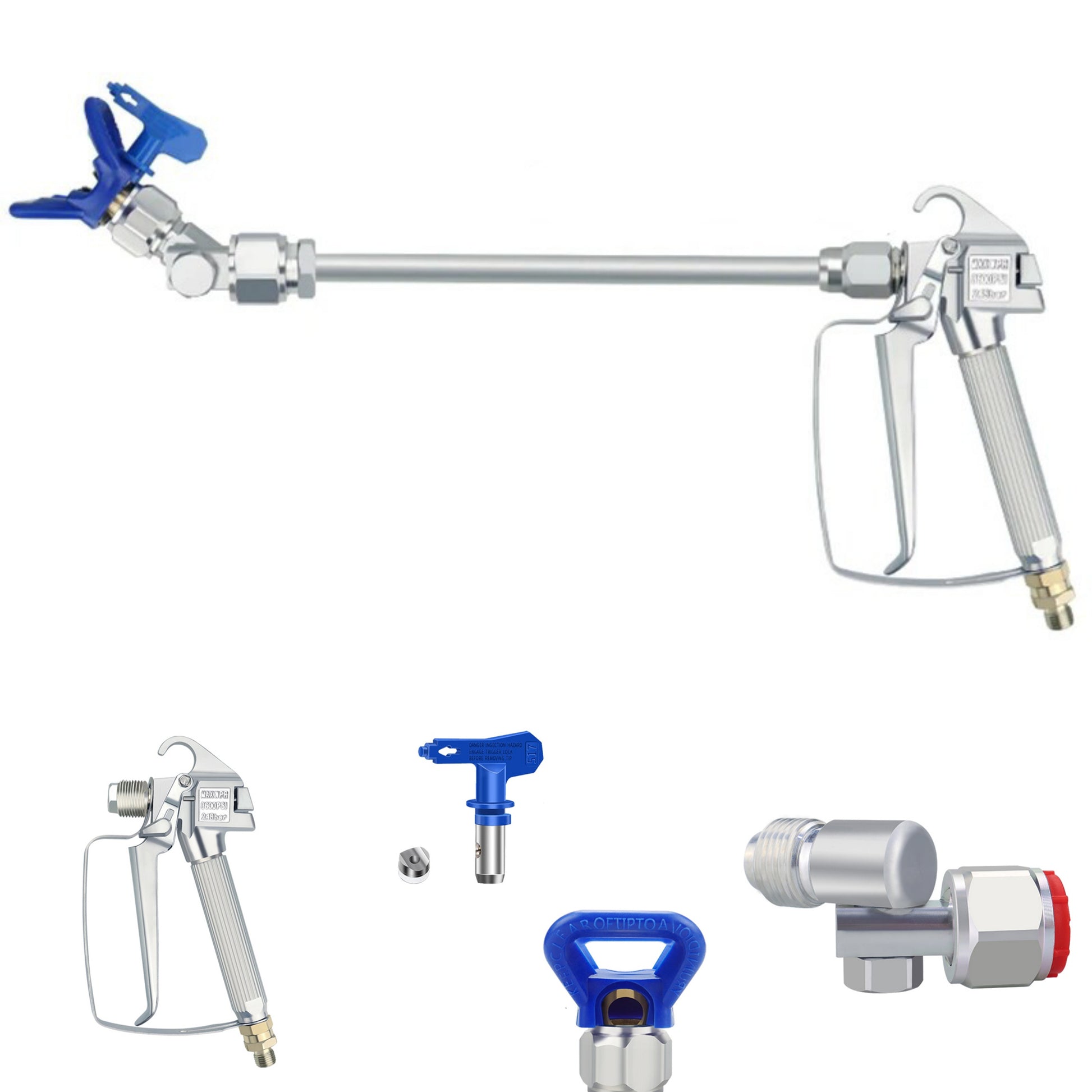 Nuevo. Lote pistola Airles completa, extensible 30cm, cabezal angular 360 grados, portaboquillas y boquilla. Completa: Pistola presión max 3600psi de aluminio profesional. Buena calidad. Compatible con Wagner, Graco, Titan, Airlessco, Gahe o similares.