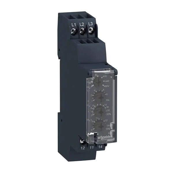 NUEVO. Relé de control y supervisión de fuente de alimentación trifásica Schneider Electric serie RM17TE00. Control de la secuencia de fases correcta L1, L2, L3 y pérdida total de una o más de cada fase. En caso de un fallo de falta de fase o secuencia de fase, el relé se abre instantáneamente. En caso de fallo de tensión, el relé se abre al final del retardo establecido. Nuevo con instrucciones y esquema montaje en caja neutral Schneider. Cubierta frontal con bisagra transparente. Potenciómetro frontal. Estado de salida de LED. Carril DIN.