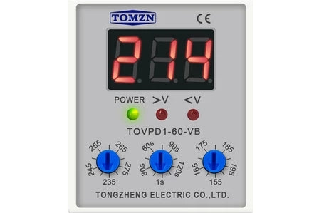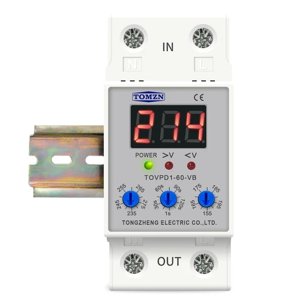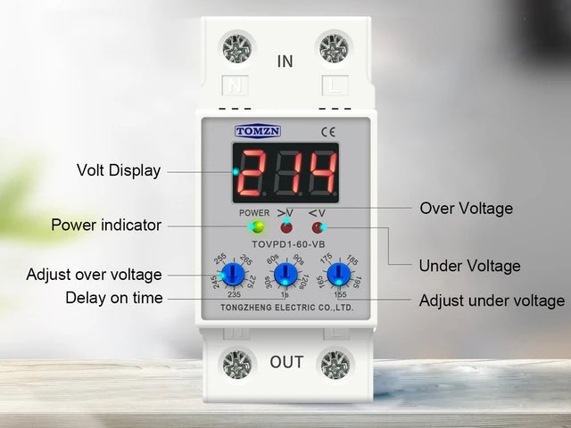 NUEVO. Limitador protector sobre tensiones permanentes ajustable con display voltímetro lectura instantánea. Hasta 60A. Auto rearmable y ajustable en rangos de sobre tensión y baja tensión. AC230vac 50/60Hz. 2 polos. Uvo: >235v-280v. Uve: <155v-200v. Autorearme regulable: 1s- 135segundos. Disparo: 1segundo. Leds indicativo estado. El dispositivo re-alimenta después del tiempo asignado , cuando la energía alta o baja vuelve a la normalidad.