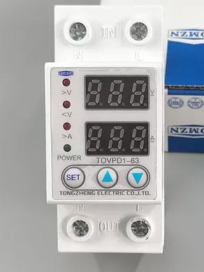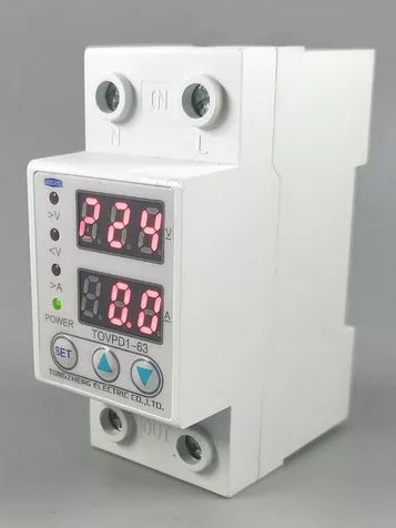 NUEVO Limitador protector sobretensiones permanentes Nuevo. Hasta 63A/2p - 14.49kva. Auto rearmable y ajustable en rangos de sobre tensión y baja tensión. Indicador de voltaje y amperimetro. AC230v 50/60Hz. 2 polos. Uvo: >270+-5V. Uve: <170+-5V. Autorearme: 60segundos. Disparo : 1segundo. Led idndicativo estado. El dispositivo re-alimenta después de 1 minuto, cuando la energía alta o baja vuelve a la normalidad.