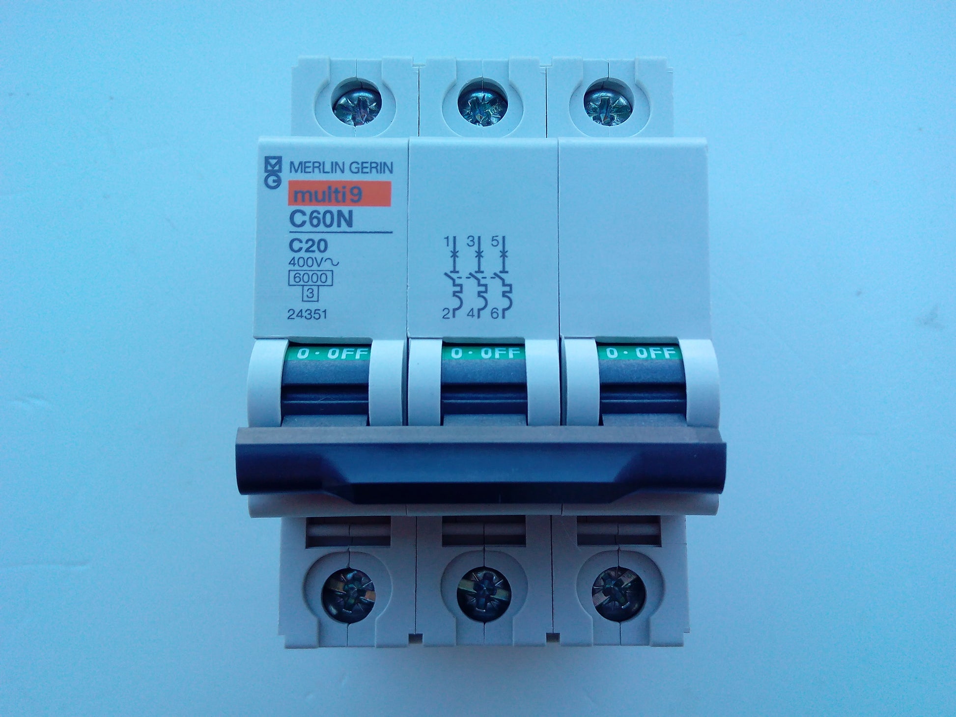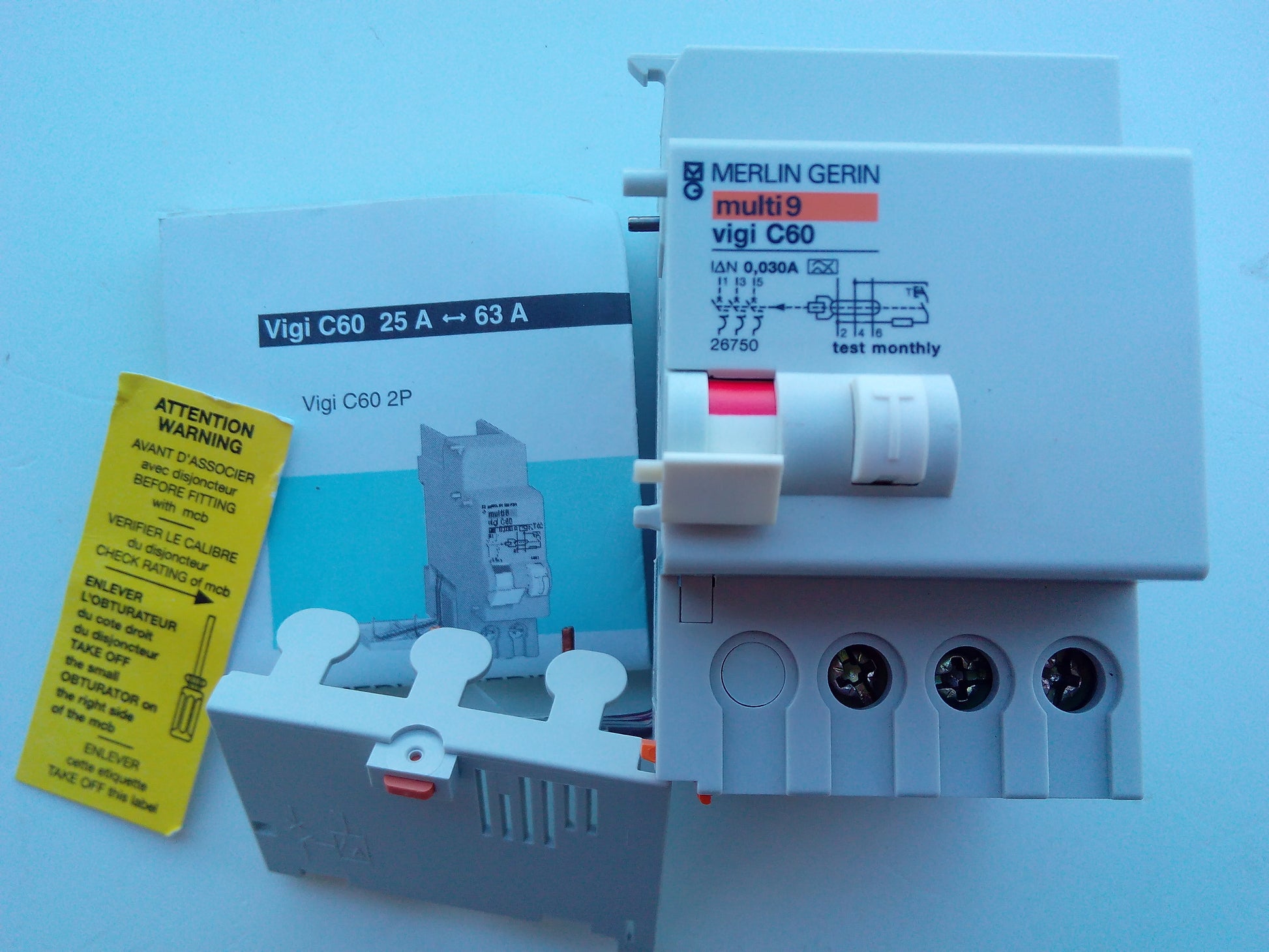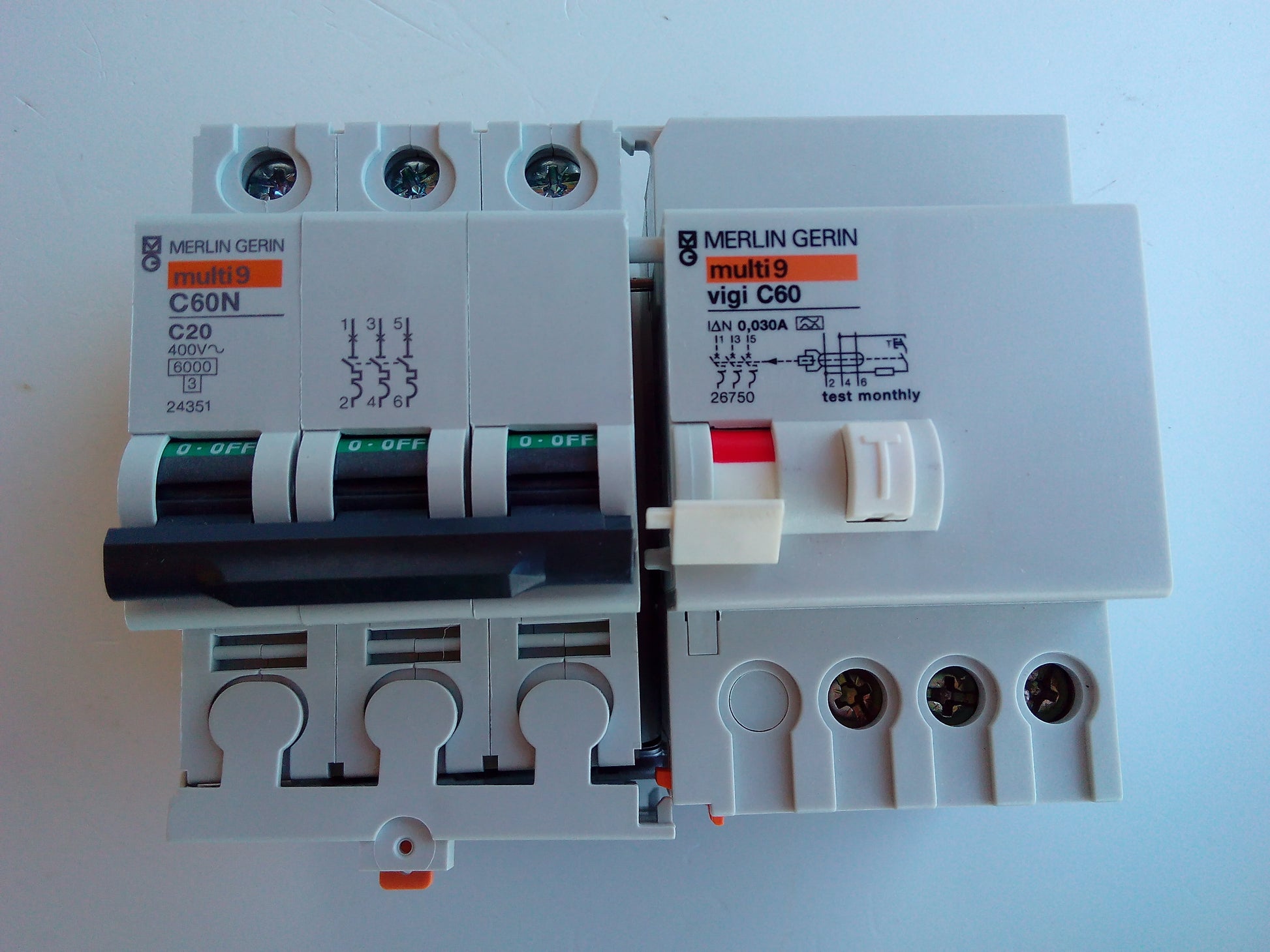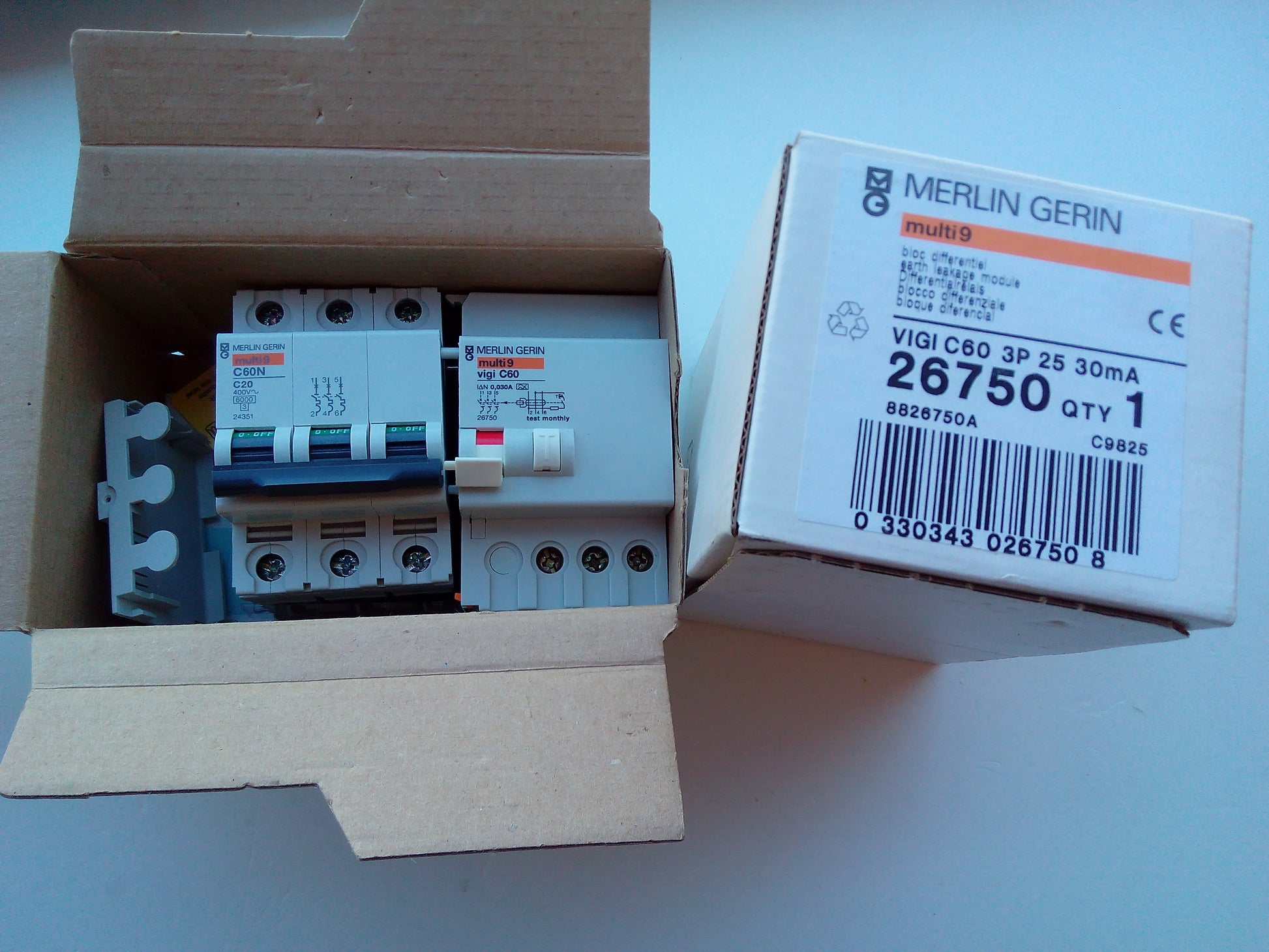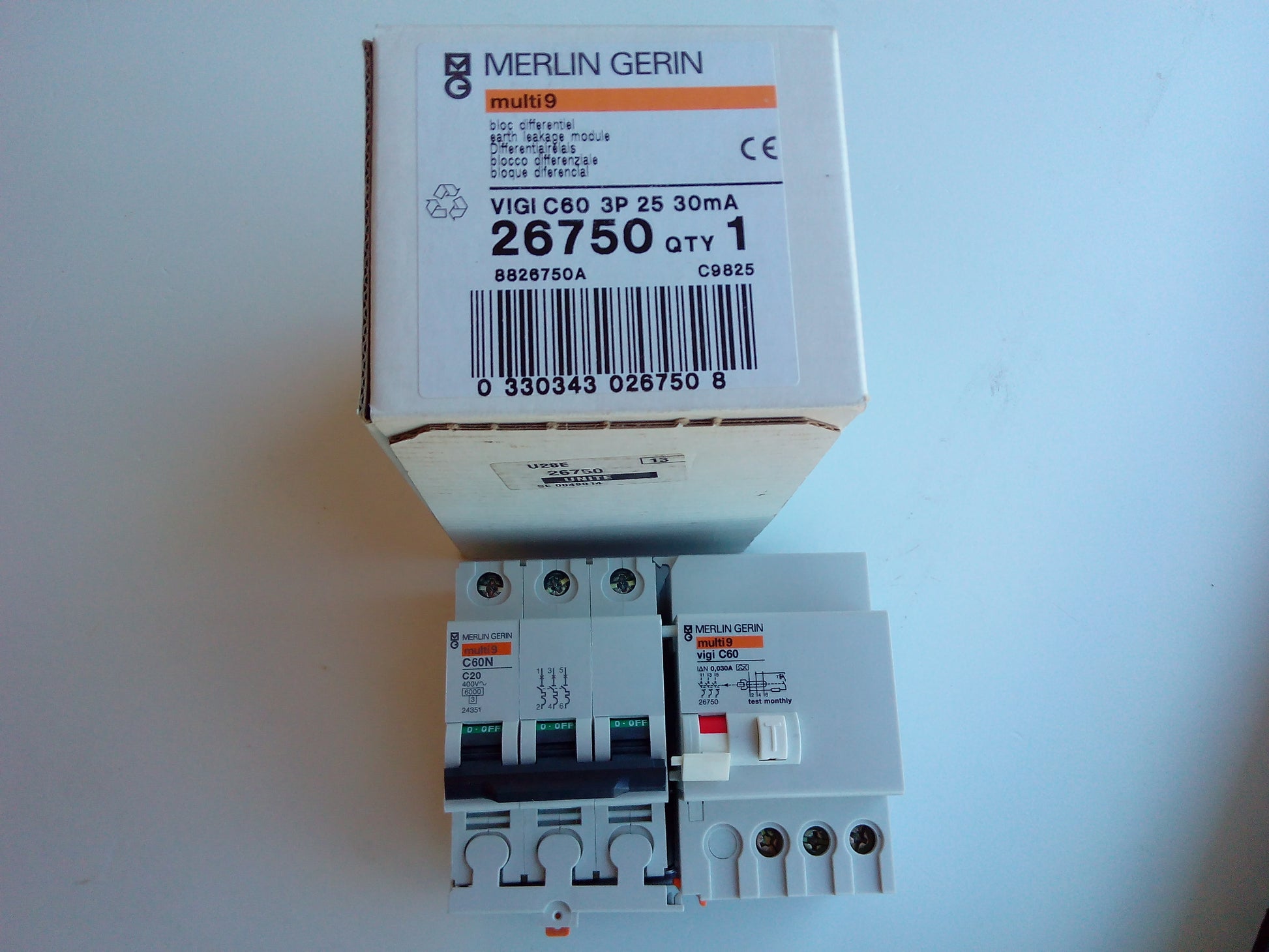 NUEVO Merlin Gerin multi9 en caja: Magneto térmico C20A/3p 24351 + Interruptor Diferencial bloque Vigi 25A/0.030a/3p 26750 230-415vac. RCD. Carril Din. Protección total cortocircuito y fuga derivación a tierra.